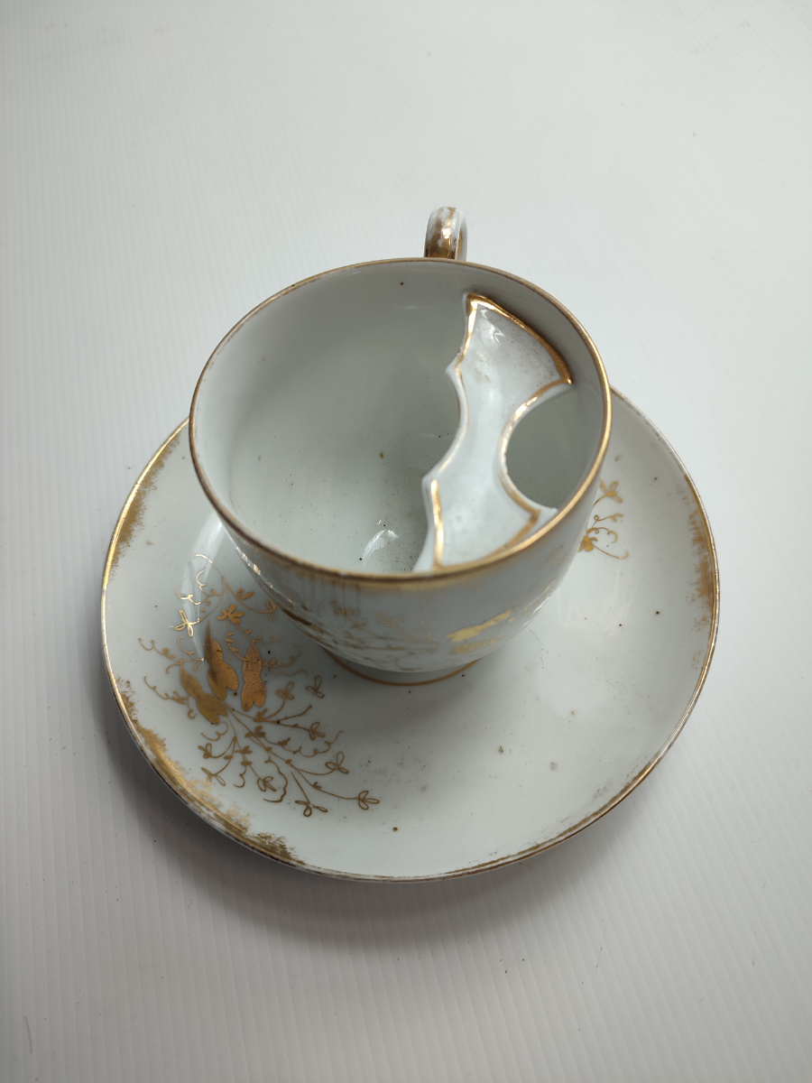 A beautiful gilted Victorian mustache cup with saucer, the saucer inscribed "A Present from Liverpool." Good condition.
